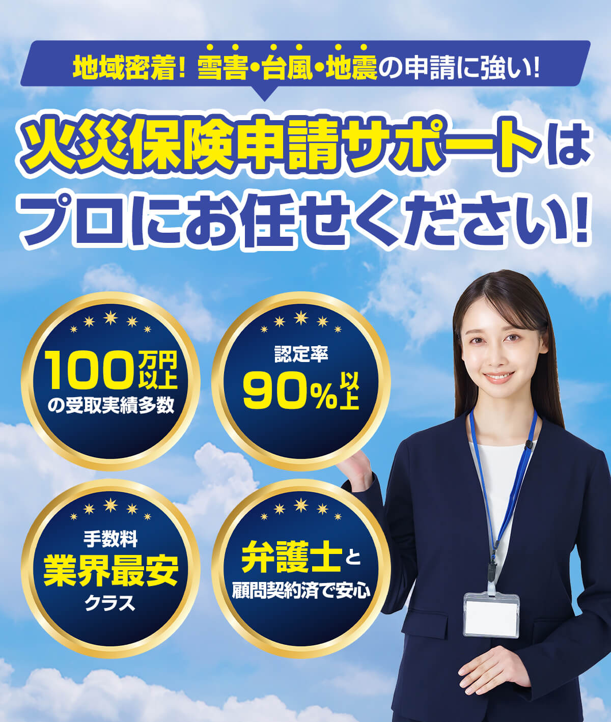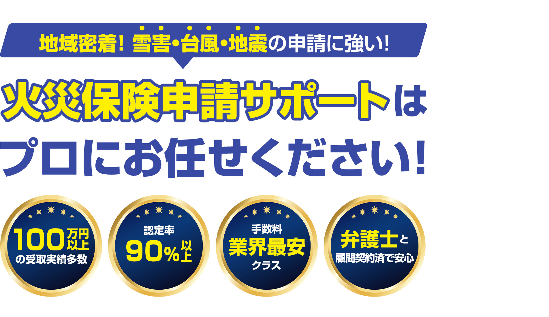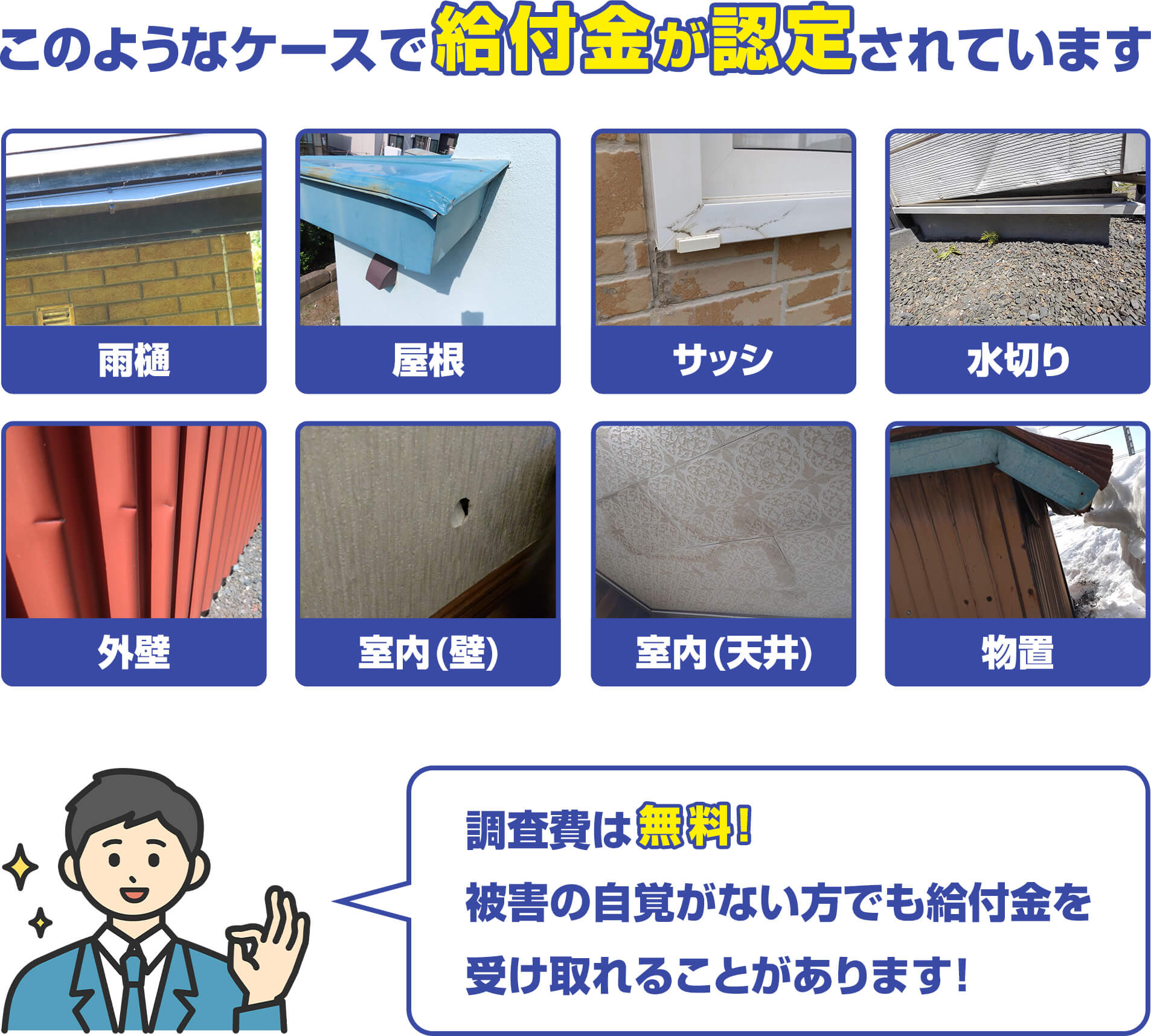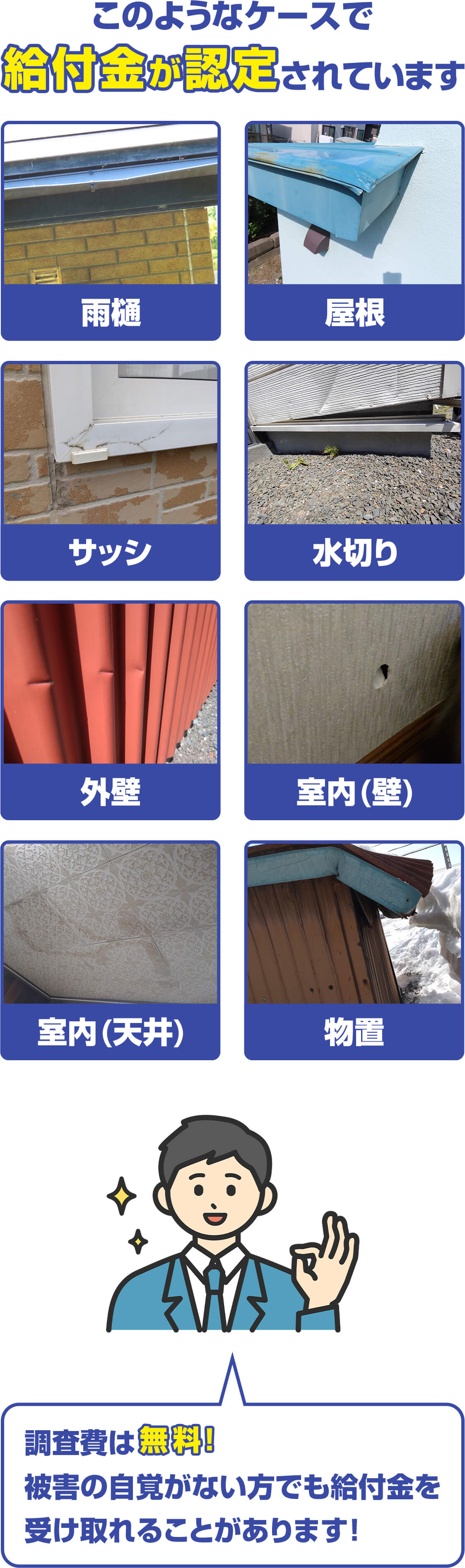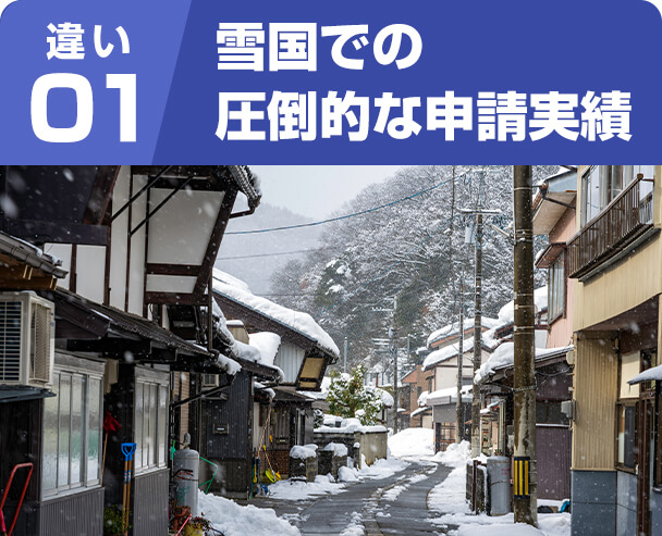 雪国の地域性や気候も含めよく熟知しているので、被害の出やすい箇所を把握しています。その為被害発見率、認定率が高く、圧倒的な申請実績を誇ります。もちろん台風やその他の被害についても豊富なノウハウがありますのでご安心してご依頼ください。