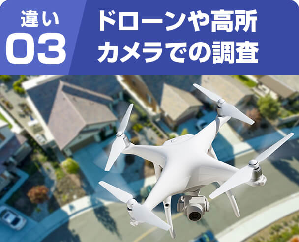 ドローンや高所カメラを使用し、徹底的に調査します。お客様が普段目にしない箇所も調査しますので、目視だけでの調査に比べ被害が発見しやすくなります。